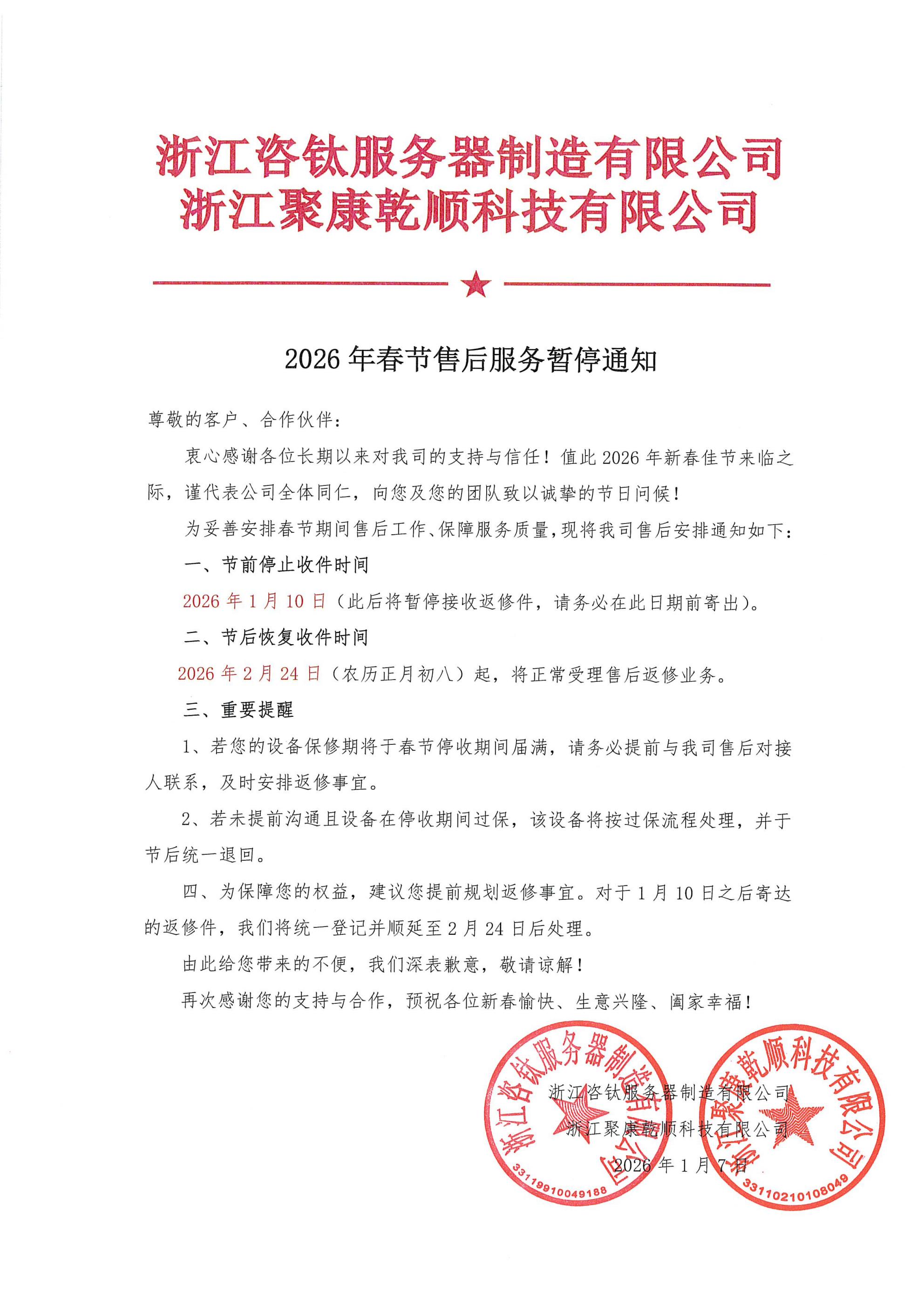 2026年春节售后服务暂停通知