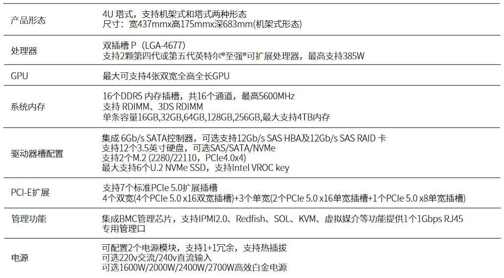 支持2颗第四代或第五代英特尔@至强圆可扩展处理器,最大TDP 385W,计算性能强劲;