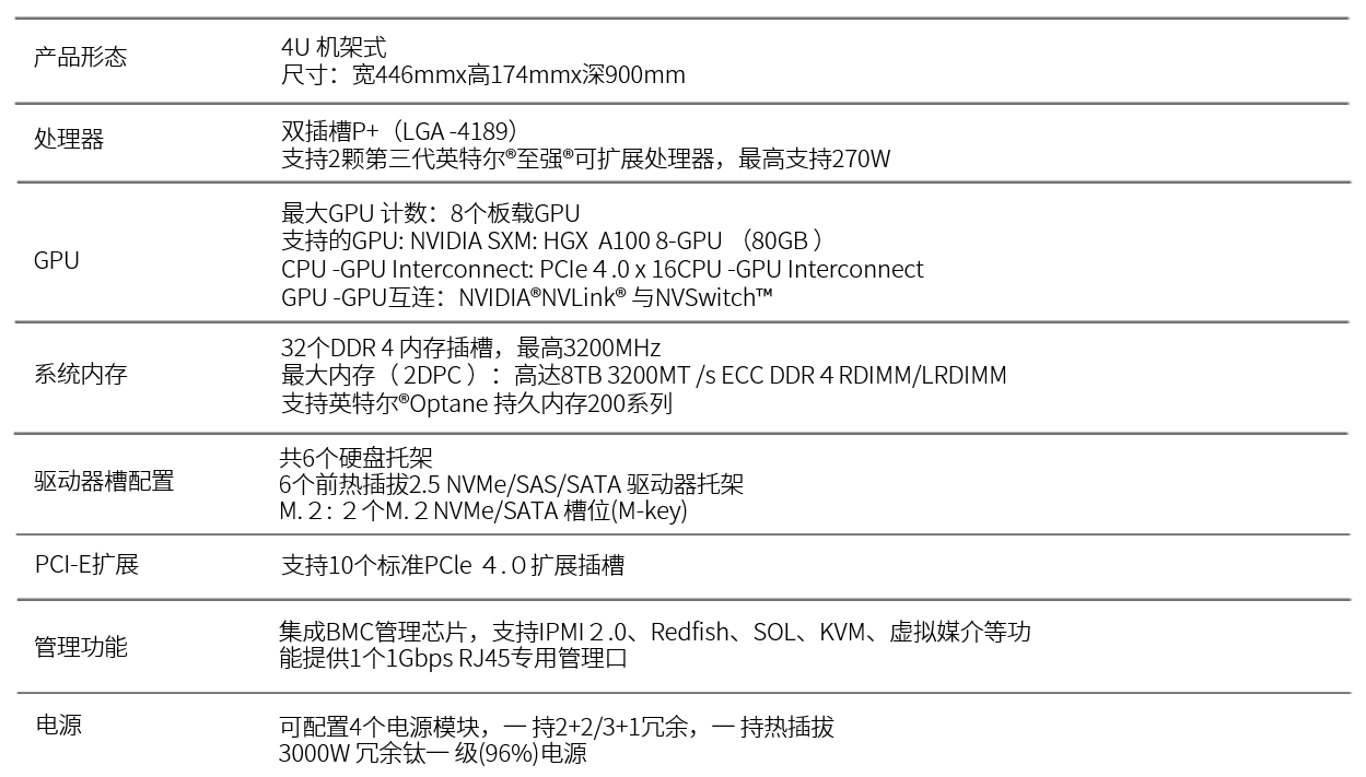 满配8颗NVIDIA® SXM 4 GPU ,通过NVIDIA®NVLINK 互联互通。