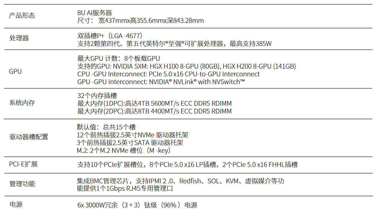 支持多达8 块NVIDIA HGX H100/H200 GPU ,搭配NVLink 和 NVSwitch 技术,实现GPU 间无缝高速互联。完美适配AI 大模型训练、高性能计算(HPC )、金融风控实时建模、药物发现分子模拟等场景,可单卡承载GPT -3.5 规模模型,解决超大规模数据运算与低延迟协同的核心痛点。