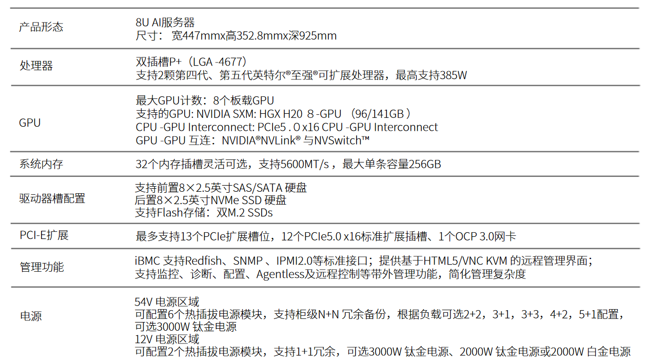 -风扇和电源冗余:N+1 冗余风扇(GPU 风扇,CPU 风扇),1+1 冗余电源(12V), N+M 冗余电源(54V)