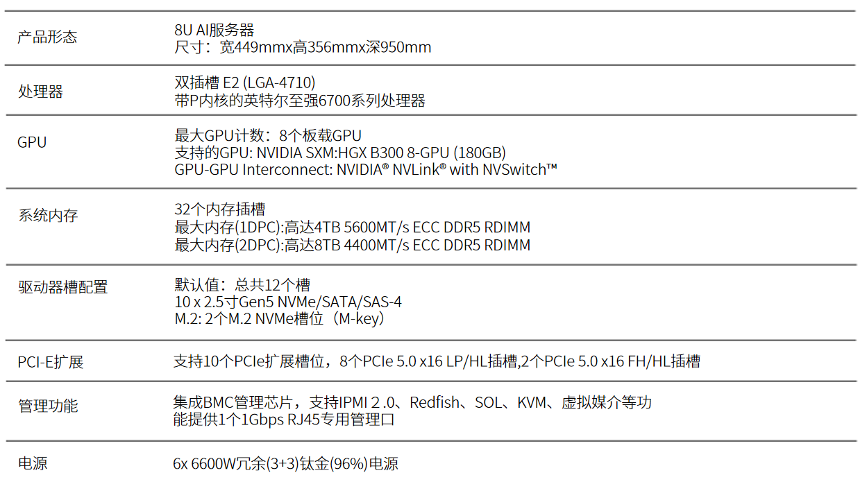 搭载 8 颗 NVIDIA HGX B300 GPU(Blackwell 架构),通过 NVLink 全互联构建 1.8TB/s 高速数据通道;双路 Intel Xeon 6700 处理器,配备 DDR5 高速内存与 8个 PCIe 5.0 E1.S NVMe 存储槽。