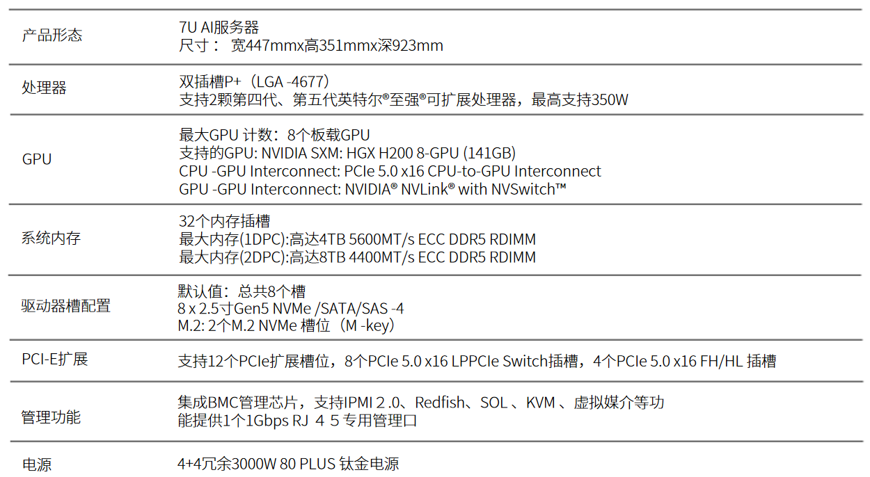 产品本身以8 颗H200 SXM5 GPU 为核心,在应用环境中,可完美适配智算中心、企业AI 机房等重负载场景,不仅能将千亿至万亿参数大模型训练周期缩短30% 以上,实现生成式AI 低延迟推理与高并发服务,还能支撑生物医药分子模拟、气候预测等HPC 任务高效推进,大幅提升科研与生产效率。