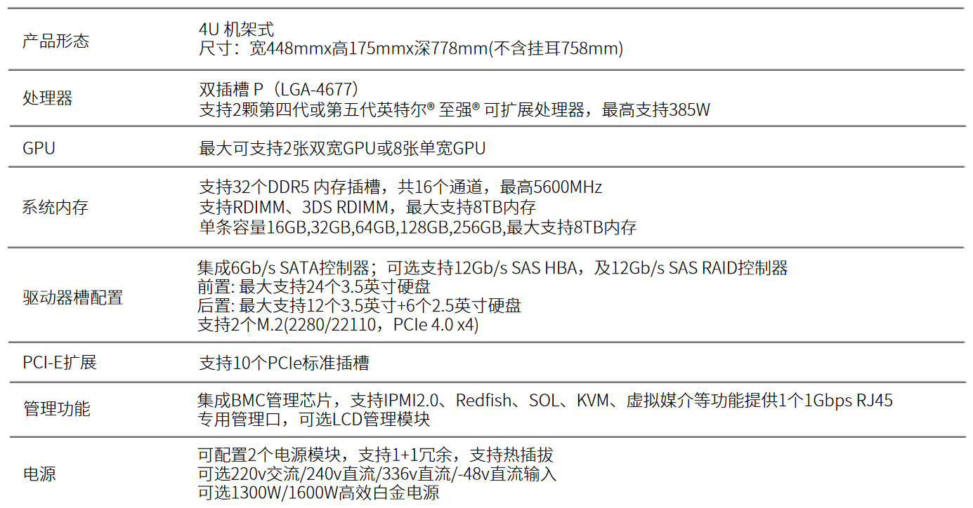 支持2个第四代或第五代英特尔®至强®可扩展处理器,采用全新微架构内核,计算性能强劲;